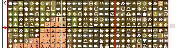 Then go through your printed key one symbol at a time. Suppose the first symbol in the printed key is a small hollow circle, with colors 743-744. Go to the SQ Stitch key and look for 743-744. Suppose its symbol is a triangle, instead of the small hollow circle. Click on the triangle to bring up the dialog box, find the small hollow circle on the dialog box, click it to highlight it, and then click the OK button. Continue on through the printed chart, checking each symbol and correcting it if necessary. Don't worry if you make a mistake; you can just keep editing symbols until the keys match. When you think you've made all the corrections, return to symbol order by clicking "By Symbol" and have a quick comparison of the two keys.